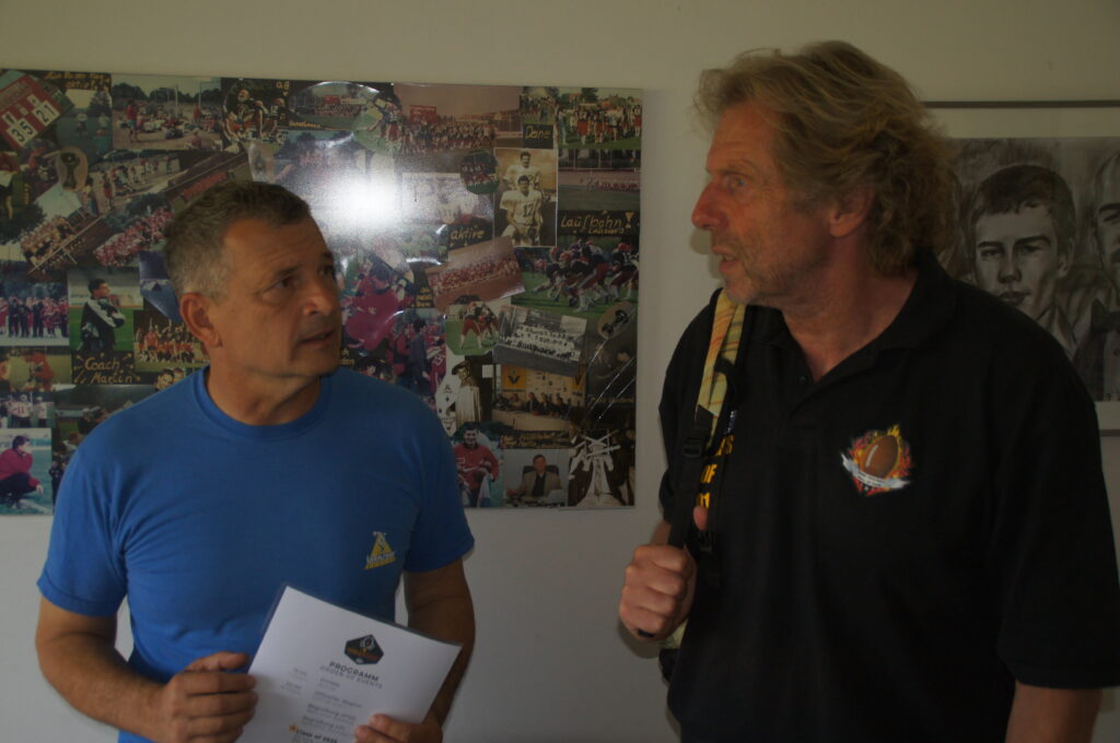 Am vergangenen Sonntag überraschten wir Heinz Sauer in der Halbzeitpause des GFLJ-Viertelfinalspiels Troisdorf Jets – Dresden Monarchs und überreichten ihm die Einladung für die offizielle Ehrung am 10. Oktober in Dresden.